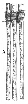 The Figure-of-Eight Lashing this is used to fasten three poles together to make a tripod or wash stand etc. there are two different ways to do this lashing depending what you are using it for, you can start with all three spars level at the top (A) and after tying the lashing just open them out, this is ideal for something like a wash stand but obviously you would tie it lower down. But if you want something a little stronger/tighter then you start with the two outside poles with there tops level running top to bottom and the inner one upside down running bottom to top (B) and after tying the lashing you pull the inner spar down and open the others out, but be careful its not that tight it snaps the lashing. Having decided on A or B you start with a clove hitch round one of the outside spars, twist the running and standing ends together as with the other lashings, and then thread the rope round the spars over and under alternatively making a figure of eight as in the diagram, eight or nine will do. Frap in-between the spars to pull everything tight and finish of with a clove hitch on the other outside spar.